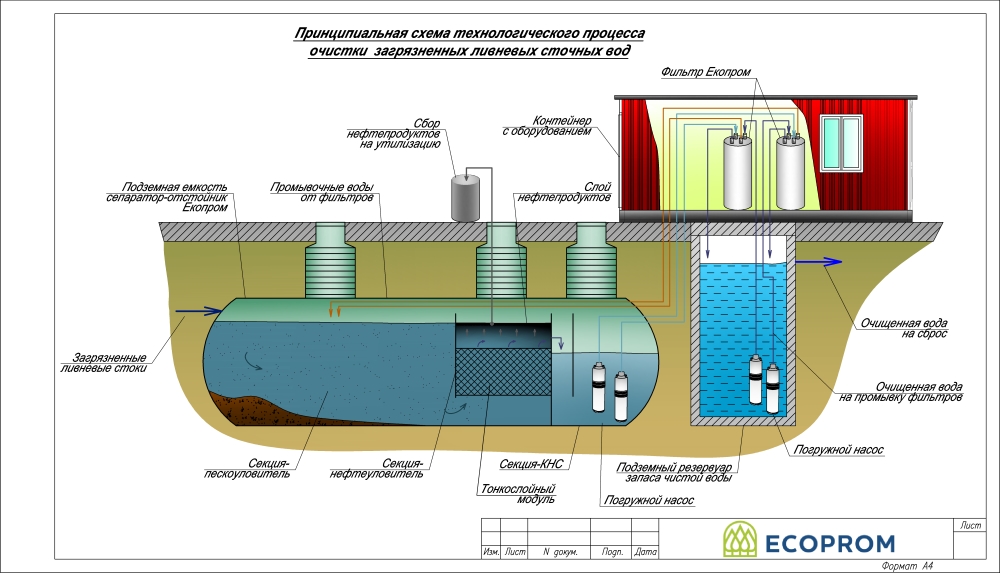 Перша ступінь - підземний сепаратор-відстійник виробництва компанії «Екопром». Ця підземна ємність складається з трьох секцій - пісковловлювач, нафтовловлювач та КНС. У першій секції проходять процеси осадження важких забруднень, заспокоювання та відстоювання води. У другій секції, нафтовловлювачі, за допомогою спеціального модуля, відбувається спливання та укрупнення нафтопродуктів, з подальшим збором в спеціальну ємність для утилізації. Остання секція підземного відстійника - КНС, в ній розташовані занурювальні насоси, які подають освітлену воду на другу сходинку тонкого очищення - блок фільтрів компанії «Екопром». Фільтри сконструйовані таким чином, що в процесі фільтрації затримуються дрібні частинки забруднень. Далі вода збирається в ємності запасу очищеної води, з подальшим скидом або використанням очищеної води. У підземній ємності встановлені занурювальні насоси для регенерації (промивання) фільтрів. Регенерація (промивка) фільтрів проходить за допомогою зворотного промивання очищеною водою в автоматичному режимі за заданим графіком. Промивні води скидаються в початок процесу очищення води - в сепаратор-відстійник.
